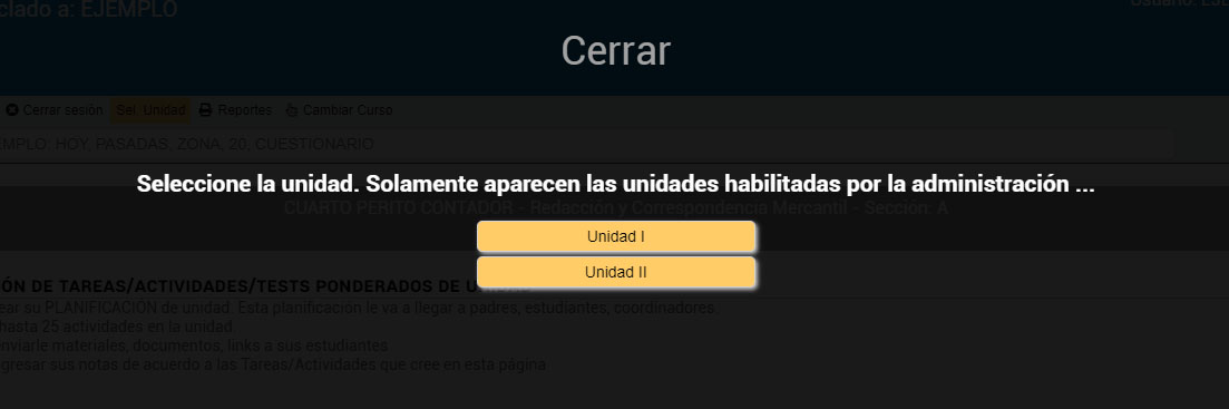 Durante el tiempo es posible que sea necesario mantener activas dos unidades o más al mismo tiempo, es decir que a los maestros se les presentará la opción de seleccionar más de una unidad. Normalmente esto sucede de acuerdo a la planificación del colegio, que es necesario que una unidad vaya terminando con exámenes mientras la siguiente unidad ya esté iniciando